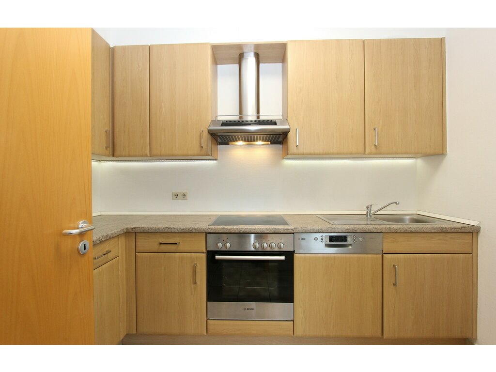 - Cuisine entièrement équipée de 6.30 m2 avec frigo + congélateur, plaques à vitrocéramique, four + hotte, lave-vaisselle et rangements encastrés,